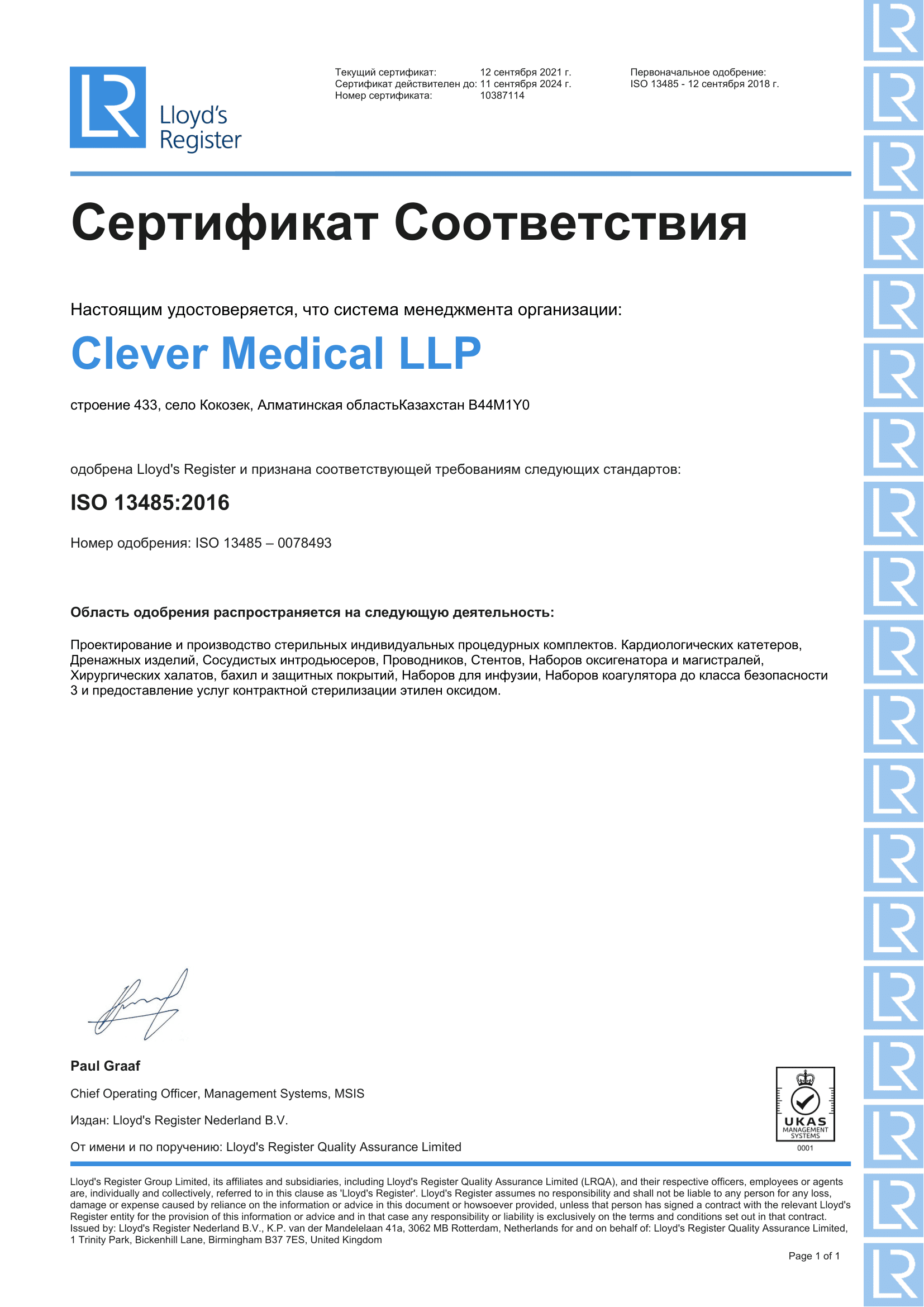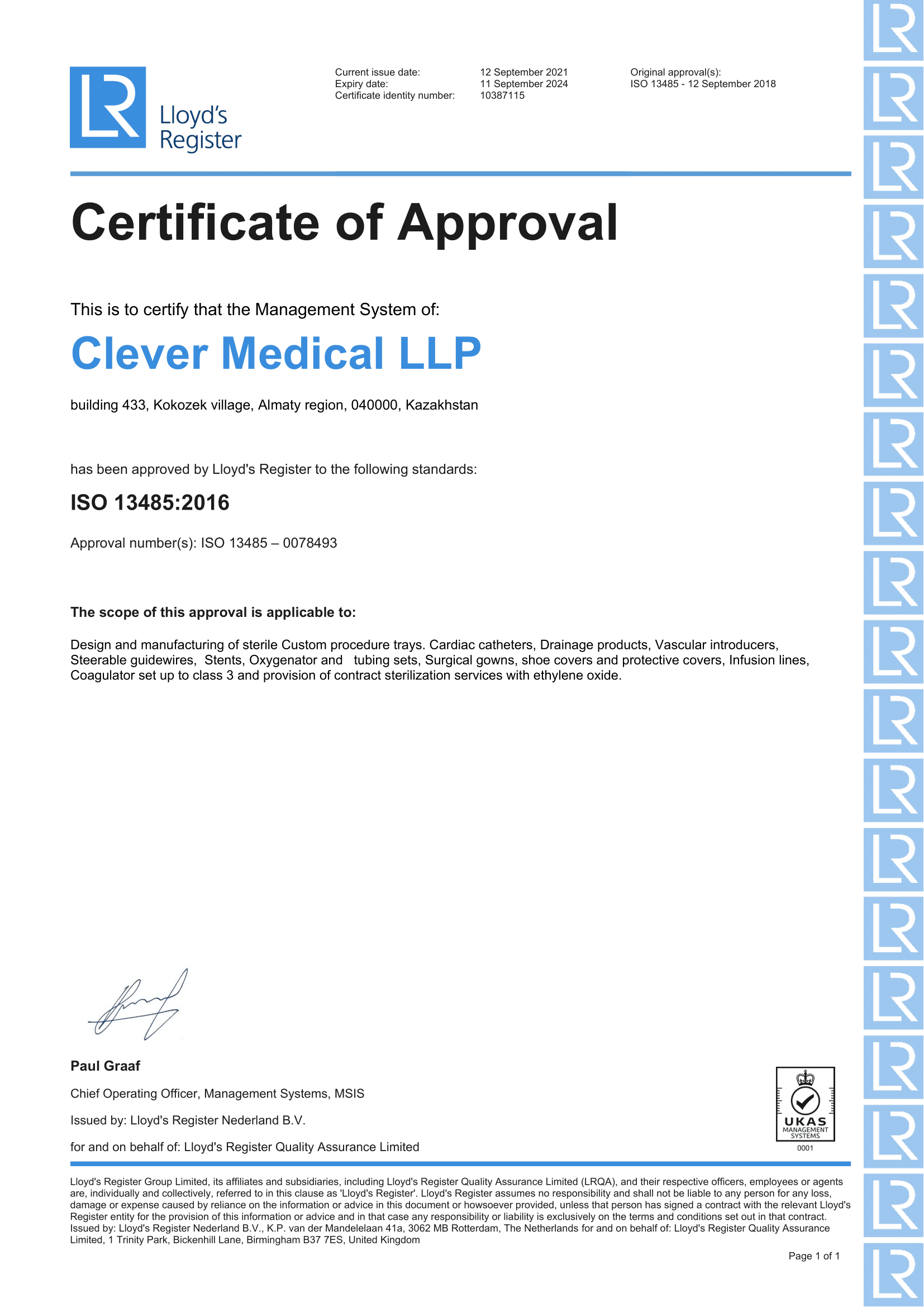 Система менеджмента качества предприятия соответствует всем мировым стандартам, одобрено Lloyd's Register и признано соответствующим требованиям стандарта ISO 13485:2016